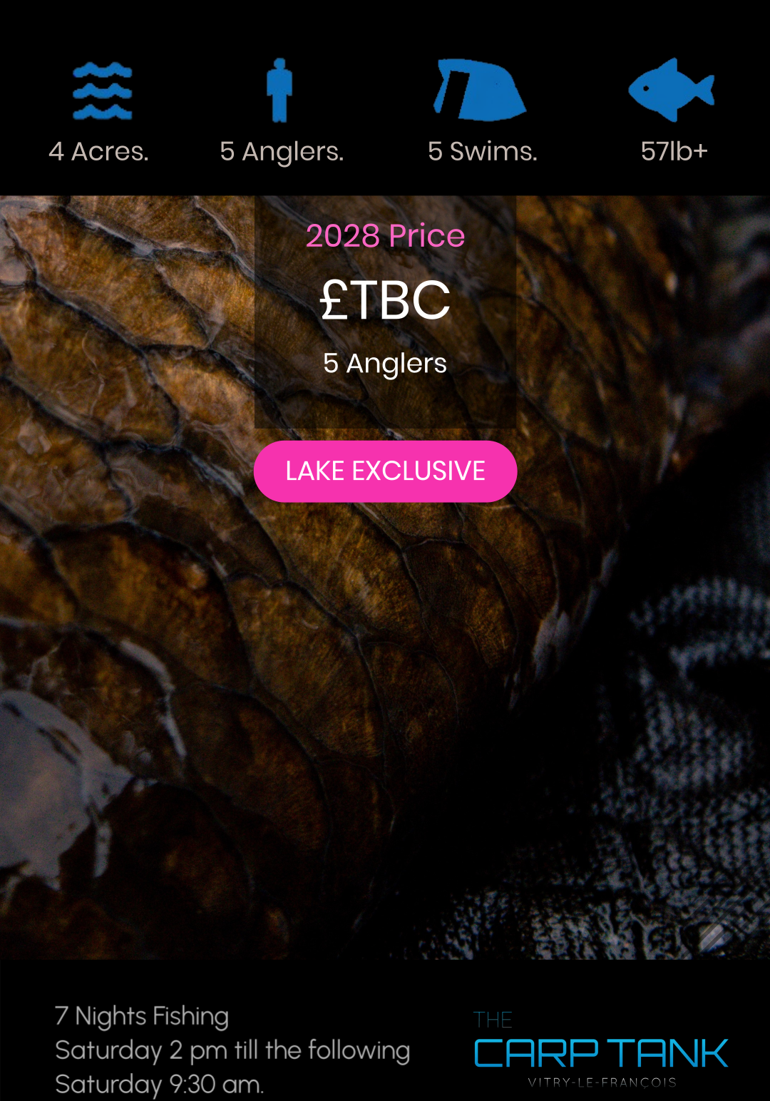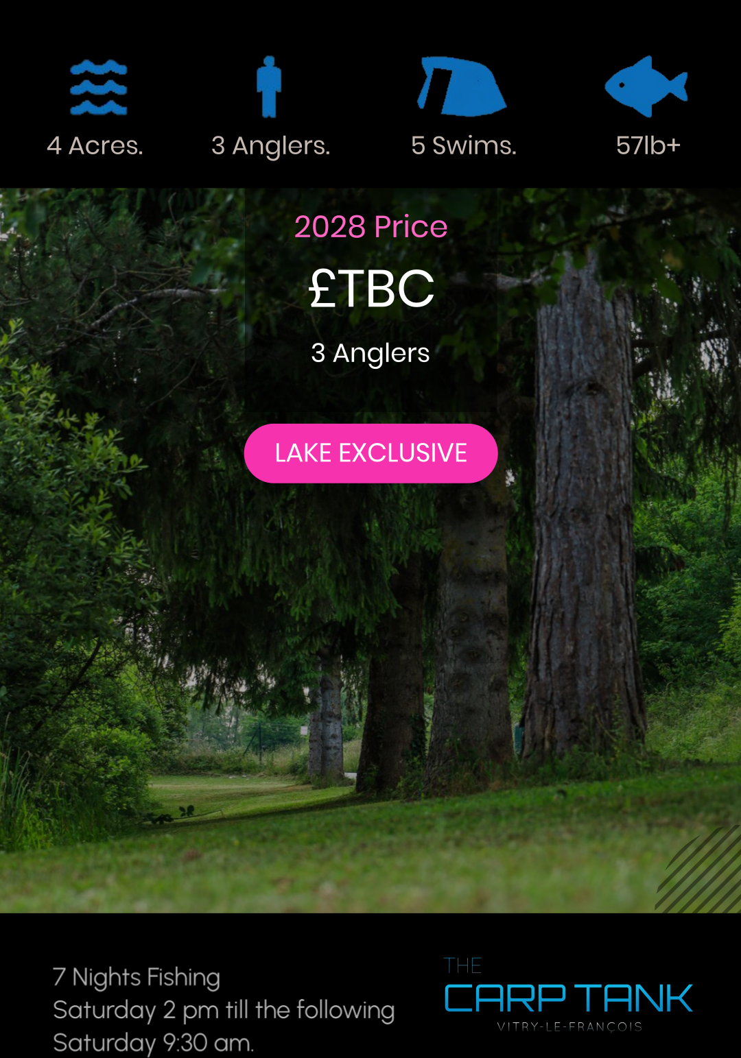 Fancy a social? The Tank can be booked either as a 3 Angler lake exclusive all fishing from The Harbour covering the whole lake or up to 5 Anglers using all available pegs.